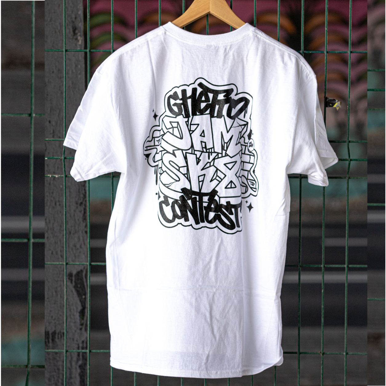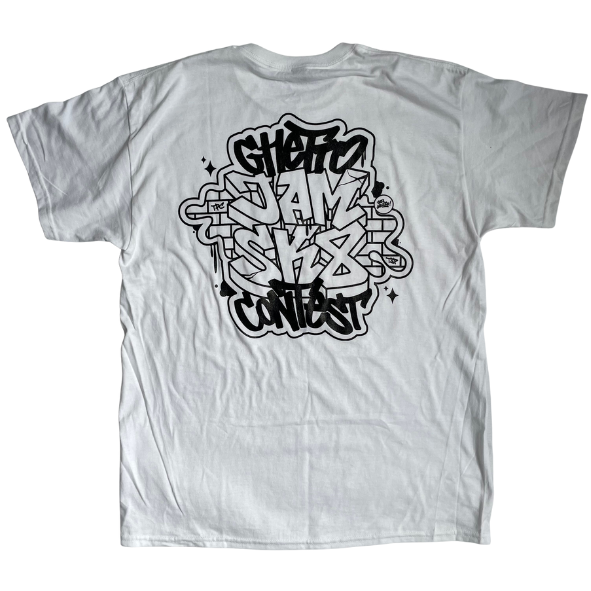 Grafika tego Ts powstała na kolejną odsłonę „Ghetto Jam”. To już trzeci raz jak robimy streetowy odlot pod Wiadim. Teamy z Bydgoszczy, Trójmiasta, oczywiście Torunia i okolic! Deskorolkowy ogień w czystej postaci. Bity spod igły Dj Stosunkowodobry. Zapach puszek z farbą, słońce, super skejt vibe i walka na triki. Grafikę taga :Ghetto Spot i Plecy z Old Schoolowym wrzutem zaprojektował Skejt Street Ziom z Torunia Peny! Yeah! Thx Bro.